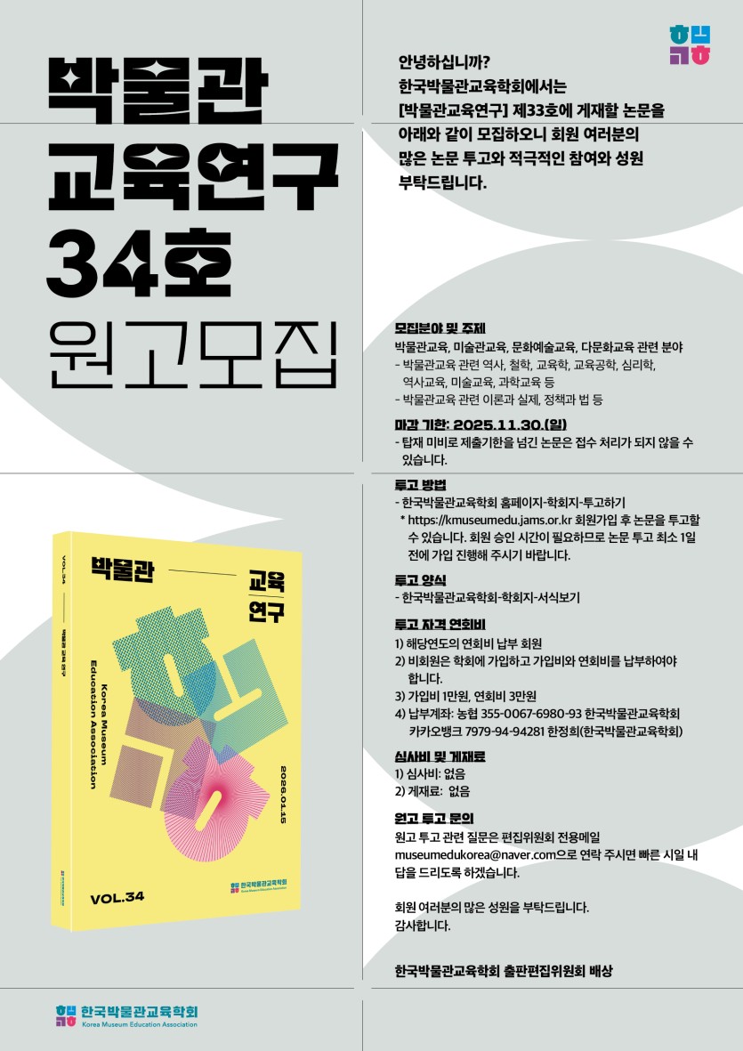 박물관교육연구 34호 원고모집 공고 페이지 정보 작성자 최고관리자 댓글 0건 작성일 25-11-20 23:29 본문 한국박물관교육학회 <박물관교육연구> 34호 원고를 모집합니다. 회원 여러분의 많은 관심과 참여 부탁드립니다. 목록 다음글2025년 한국박물관교육학회 학술행사 안내 - 제19회 한국박물관국제학술대회 25.05.15 댓글목록 댓글목록 등록된 댓글이 없습니다.